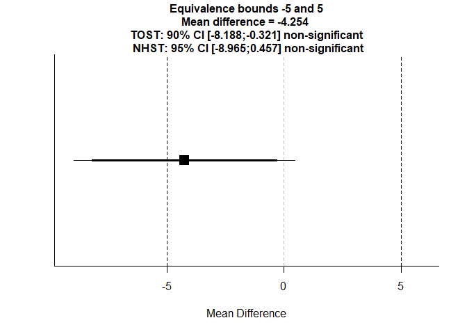 We now perform TOST with equivalence bounds of -5 and +5 units.